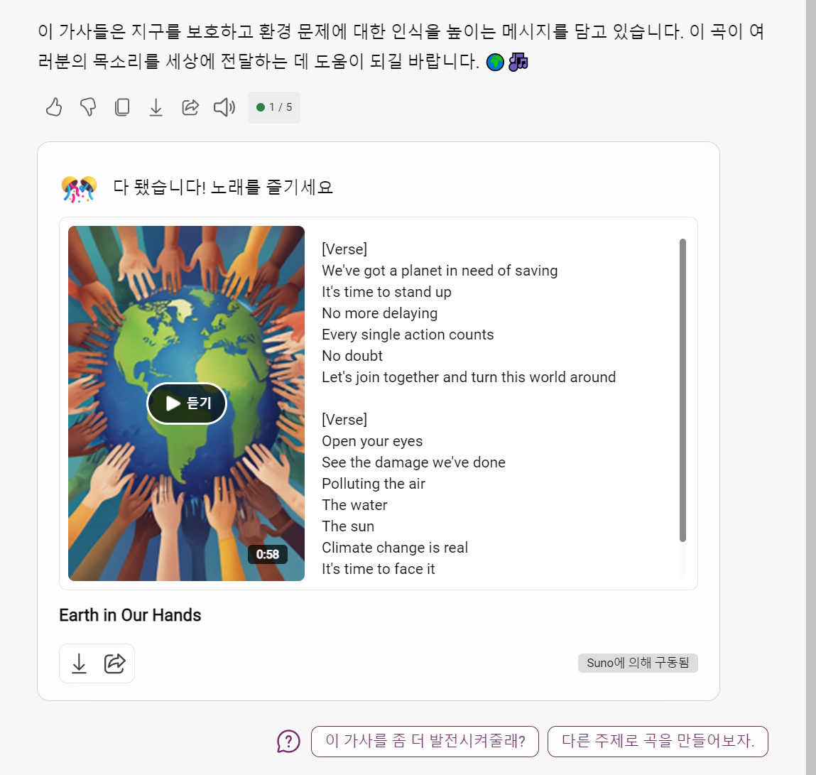 "save th earth act now를 주제로 곡을 만들자"라고 입력해 봤습니다.