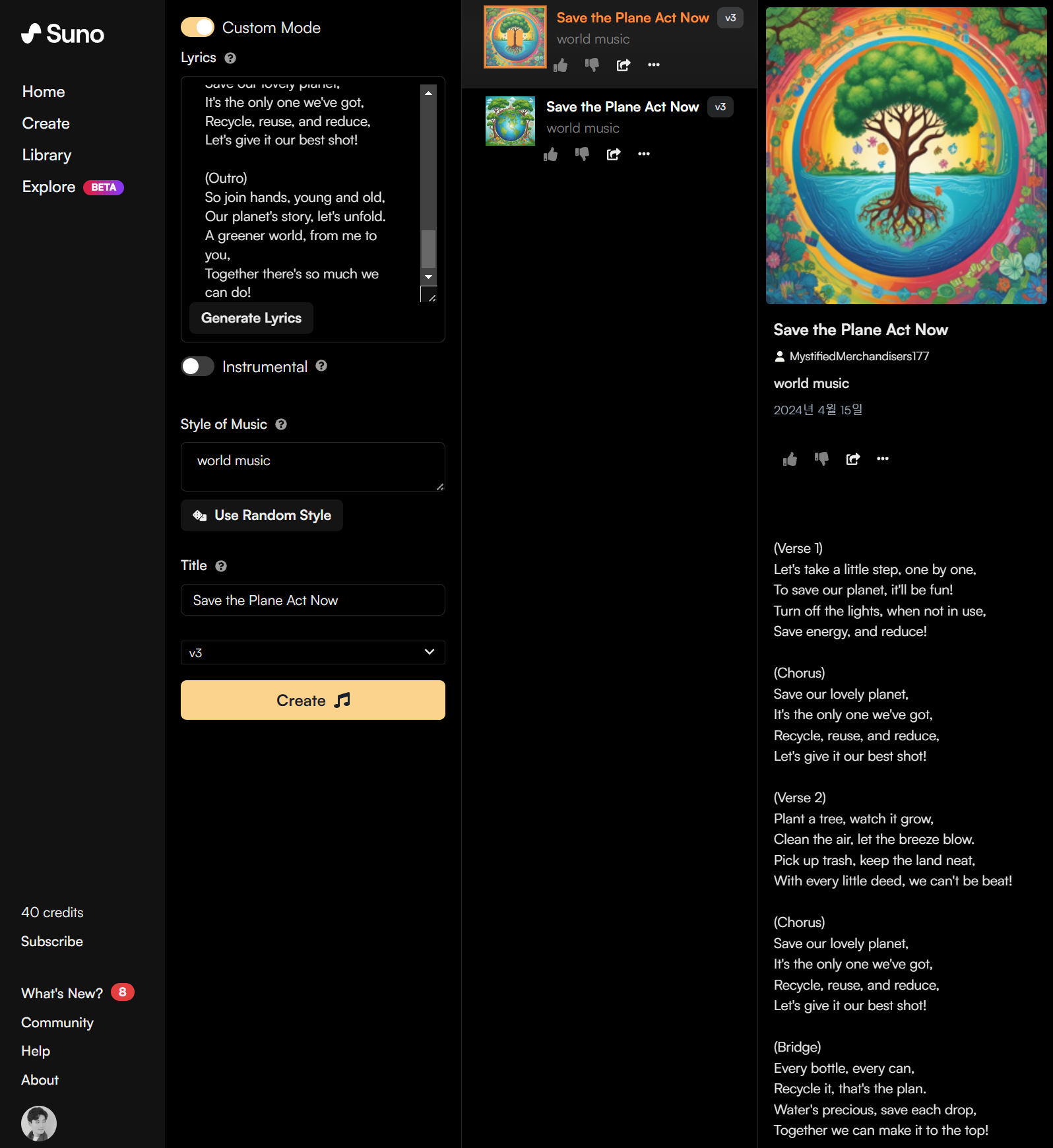 위의 가사를 붙여 넣었고, 월드 뮤직 스타일을 입력했으며, 제목도 넣어준 뒤, Create를 해줍니다.