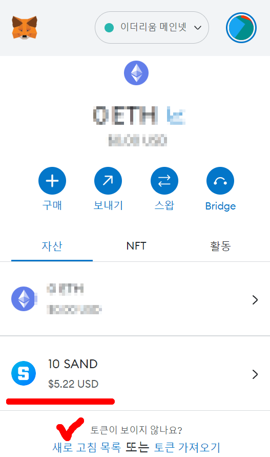 -저의 경우 현재 이더리움 메인넷을 사용하는 코인이 샌드박스밖에 없습니다.