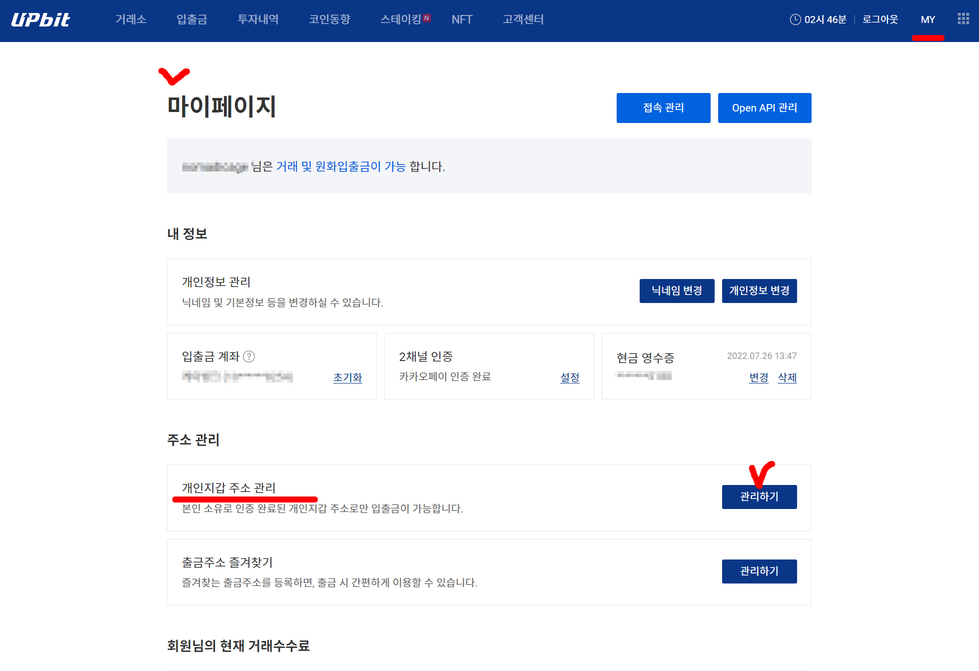 업비트(PC)사이트에 로그인 한 후, 마이페이지로 이동합니다.