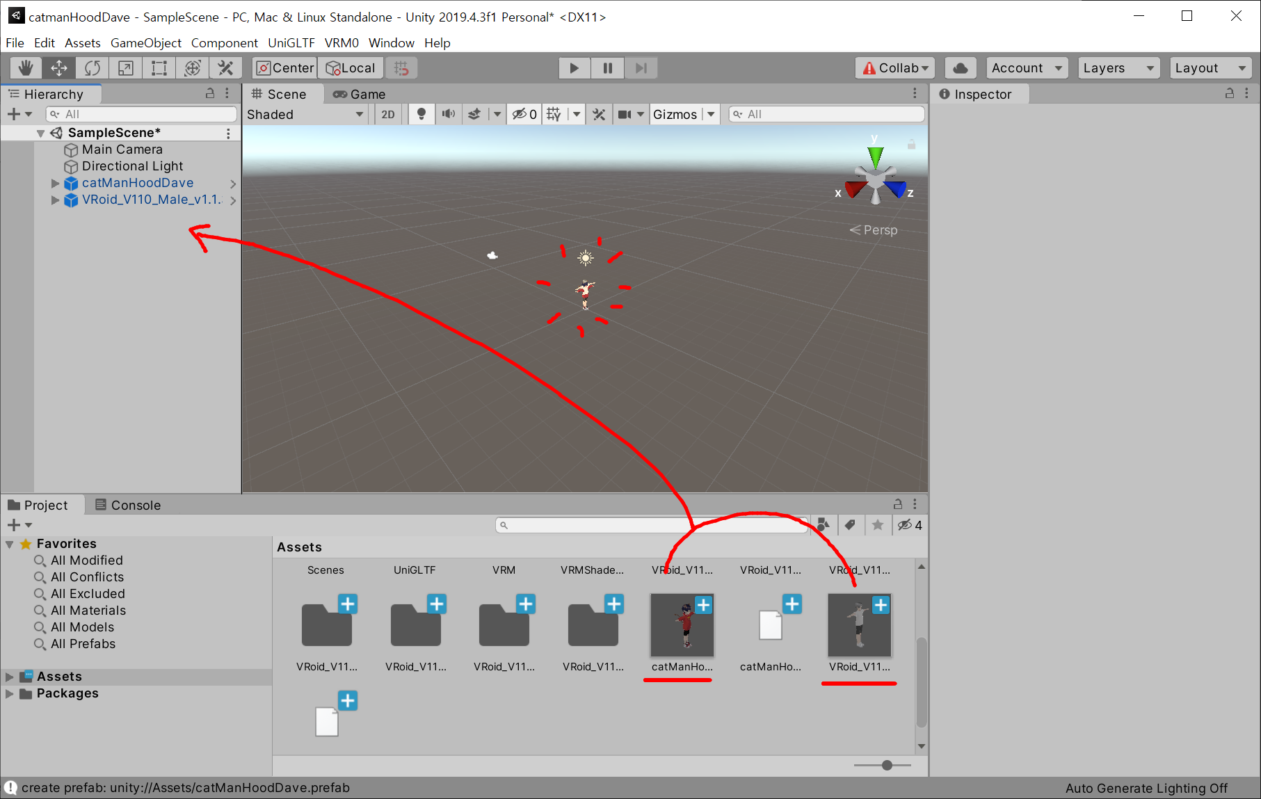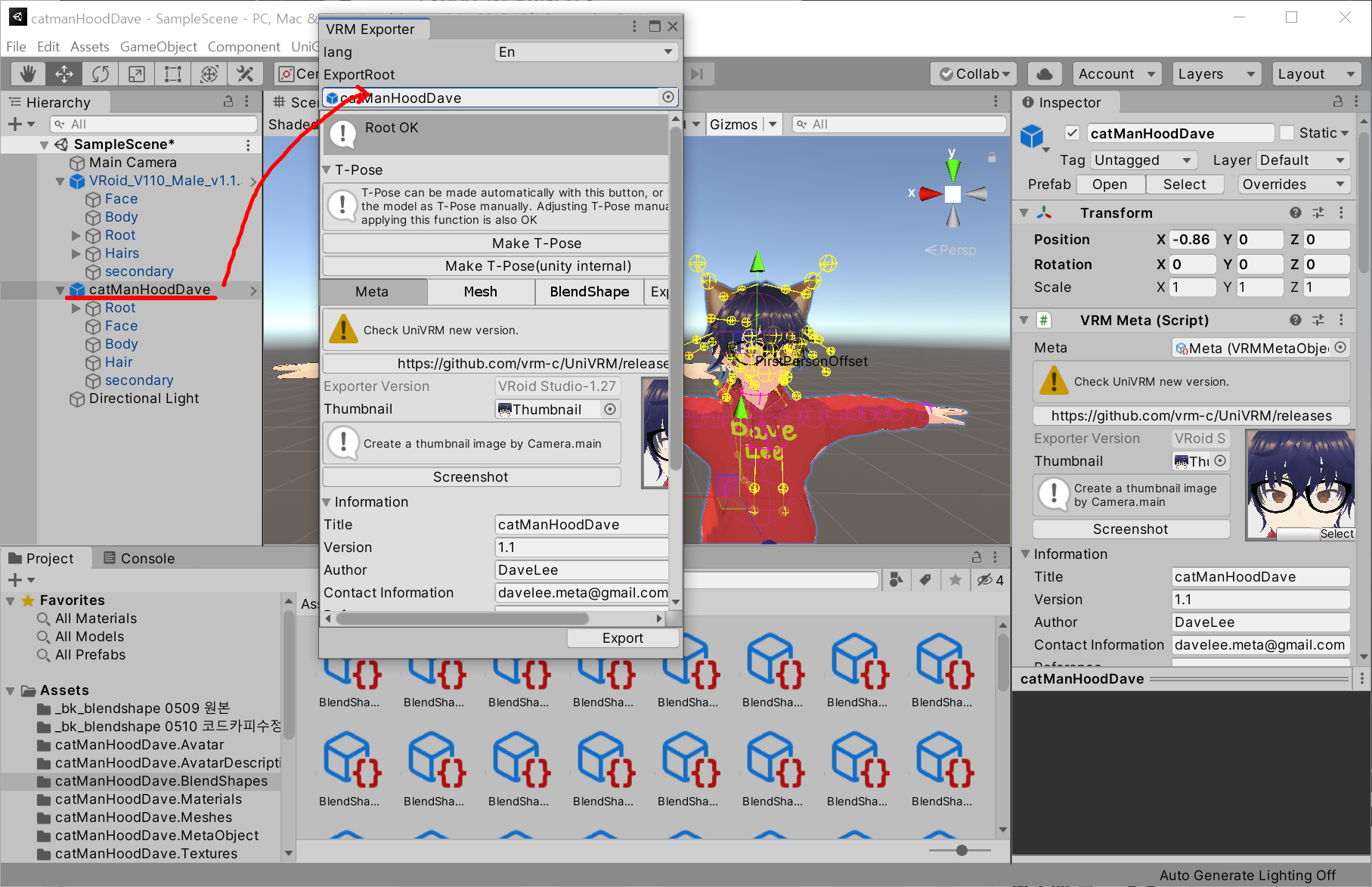 좌측 hierarchy에서 내가 만든 모델인 "catManHoodDave"를 선택하고,