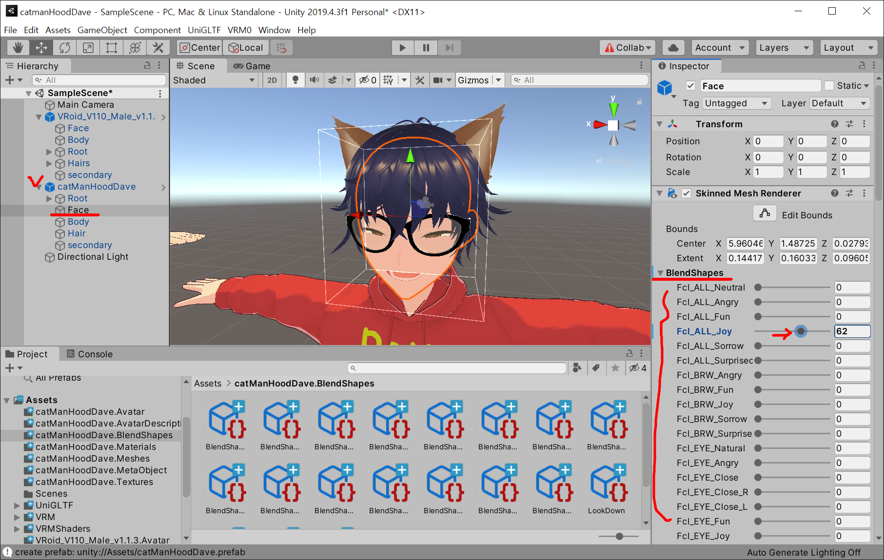나의 브이로이드인 catManHoodDave 모델의 기본파일인 BlendShape.asset 속성에도