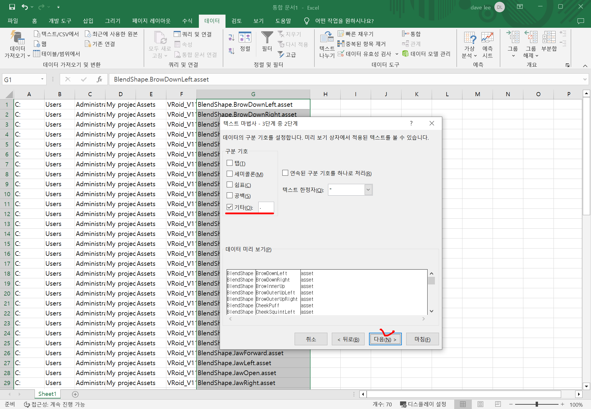 G열에 에셋 이름이 있는 시트를 모두 선택하고, 한 번 더 '.'으로 텍스트 나누기를 해줍니다.