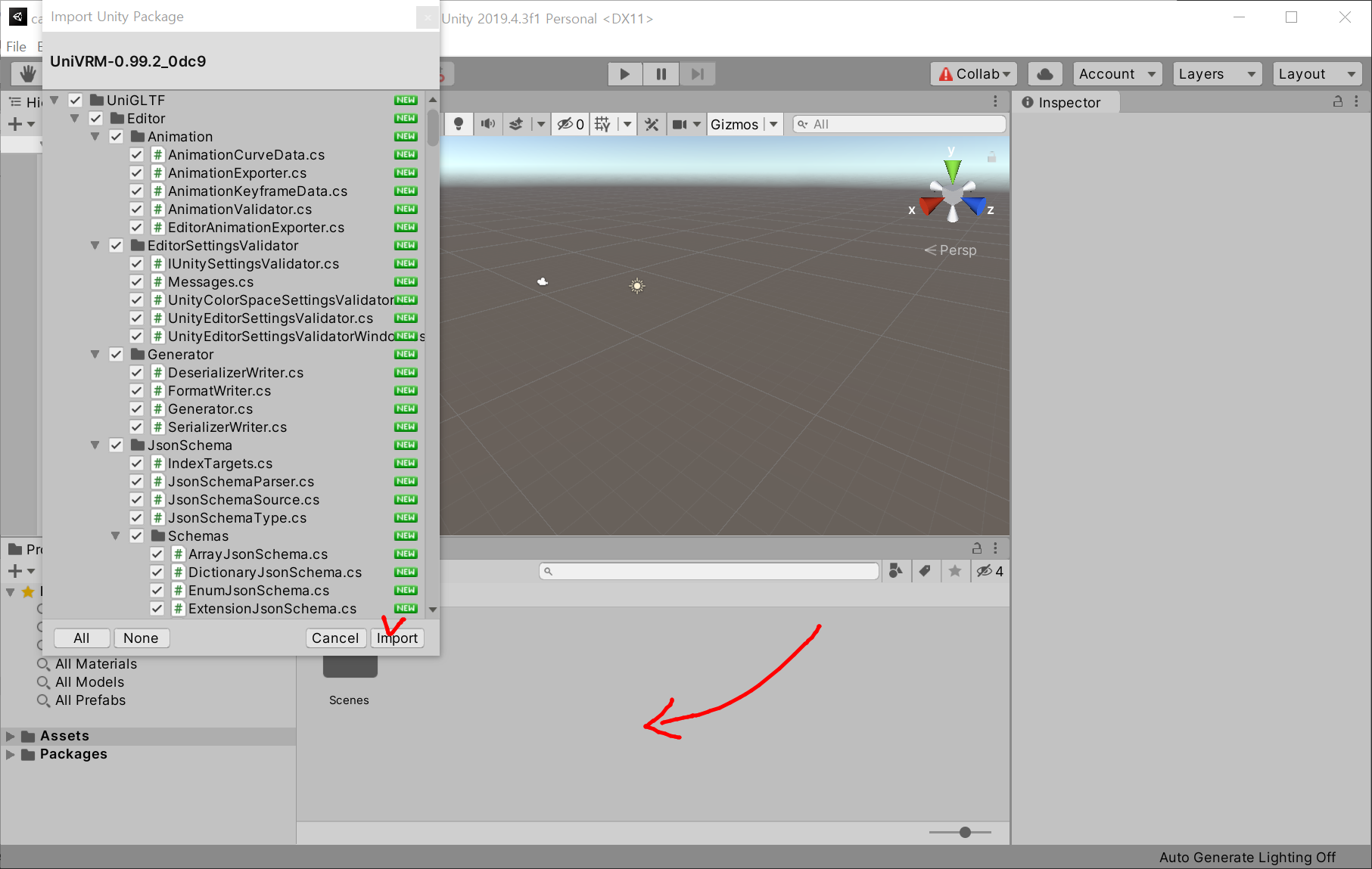 프로젝트 폴더창에 드롭하면 팝업이 뜨며, import 버튼을 눌러 패키지를 설치합니다.
