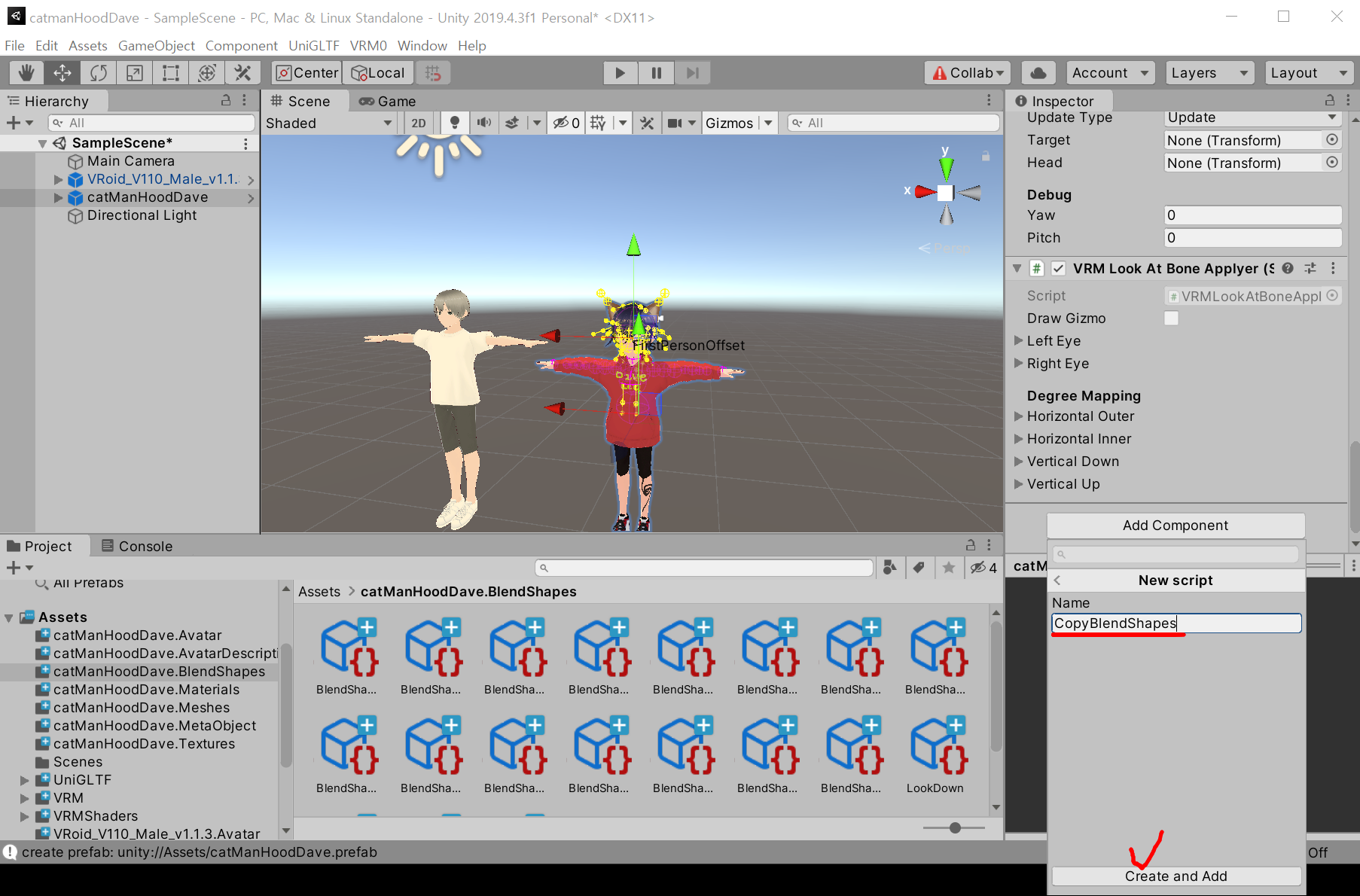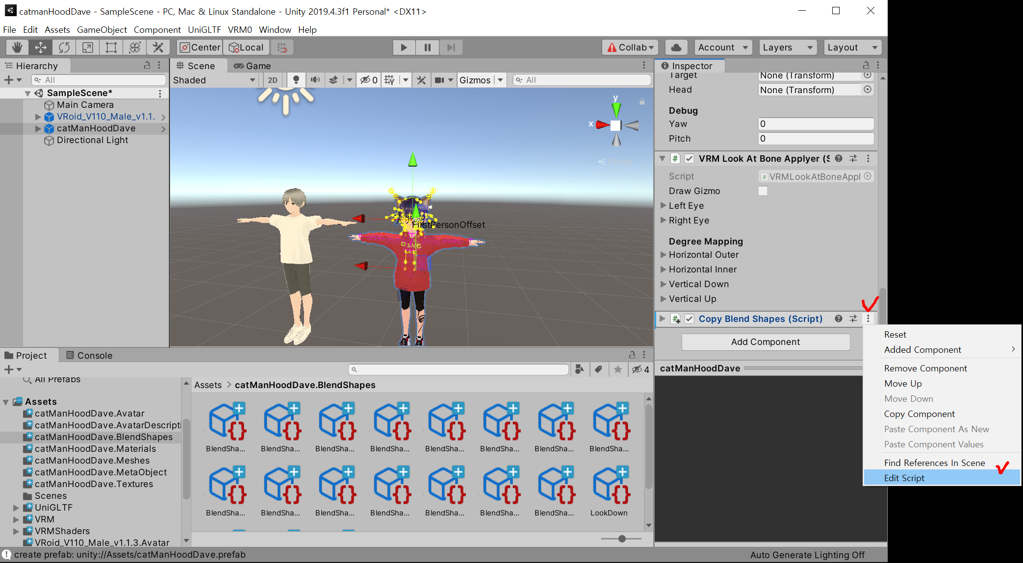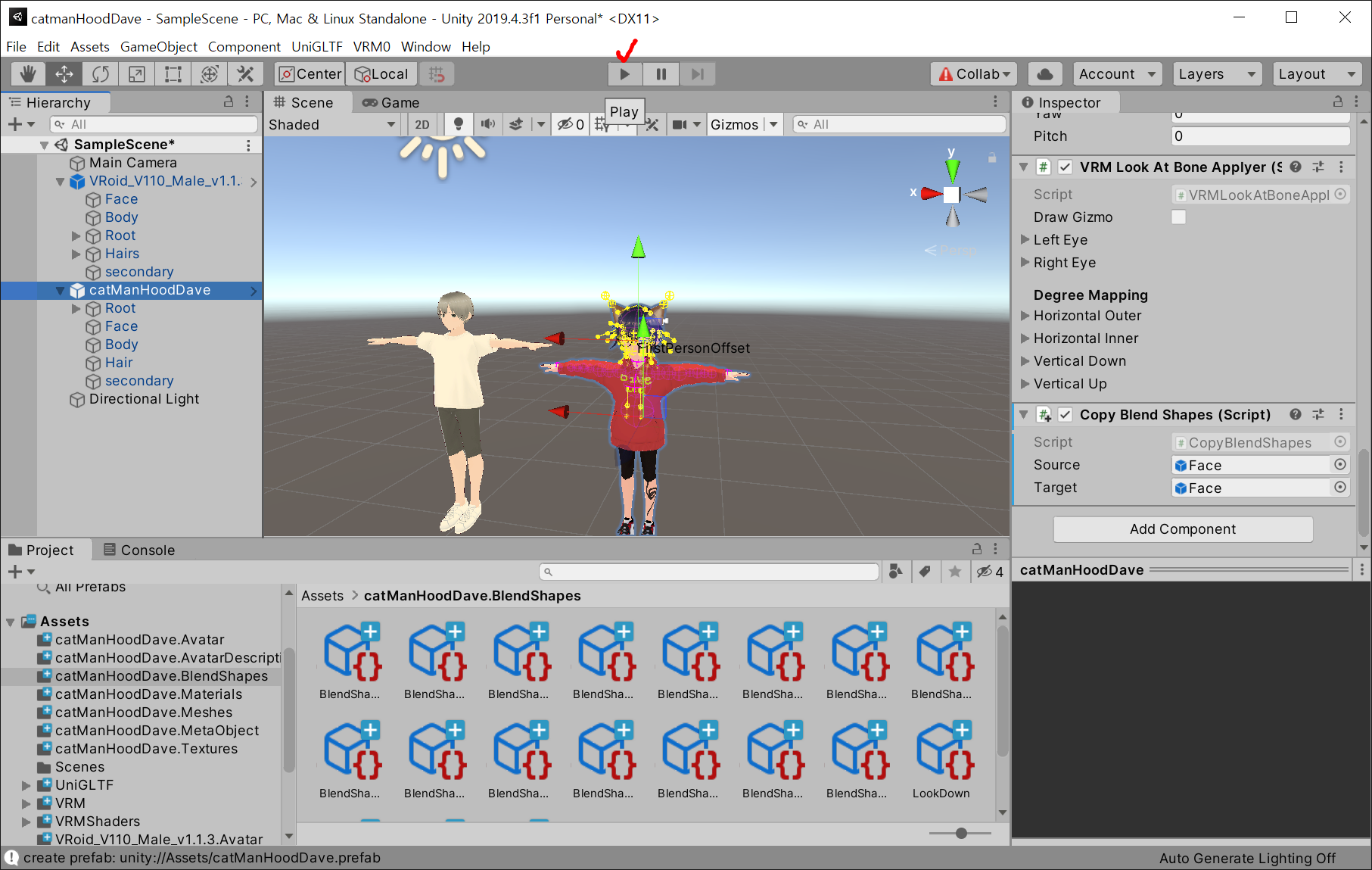 1) catManHoodDave.vrm : 내가 Vroid Studio에서 만들어 내보내기 한, 내 캐릭터 파일