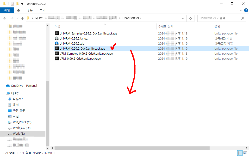 받아놓은 "UniVRM-0.99.2_0dc9.unitypackage" 파일을 드래그해서 유니티 패키지 폴더 빈 창에 드롭합니다.